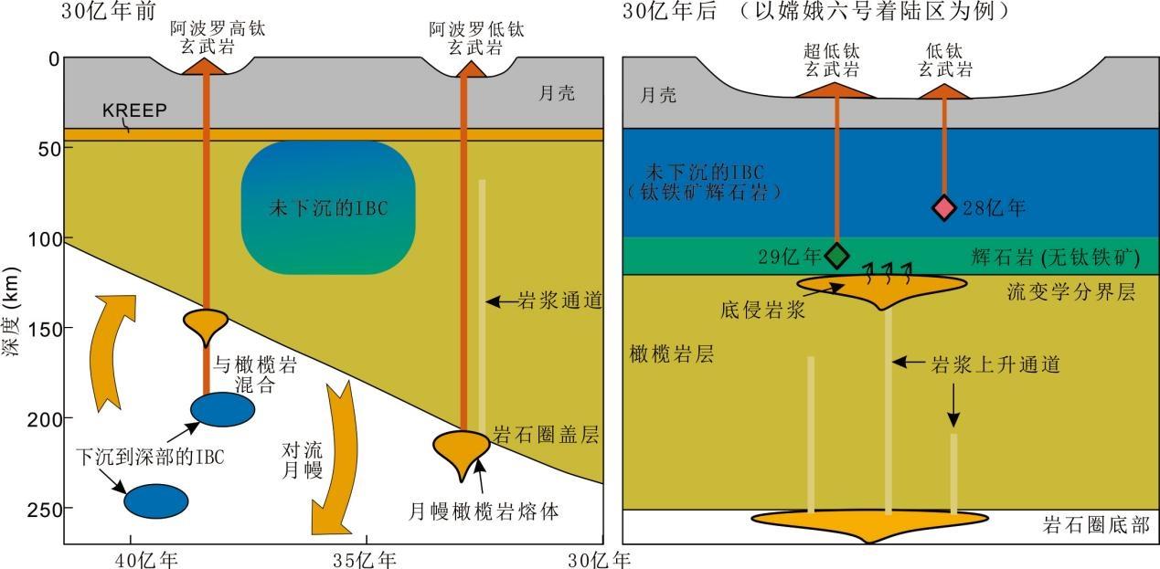 通过模拟月球里面的高温高压环境,扣问东谈主员发现,这两类岩石来自月球早期岩浆海洋冷却后酿成的两种不同岩层:平庸的辉石岩层和含钛铁矿的辉石岩层(IBC)。